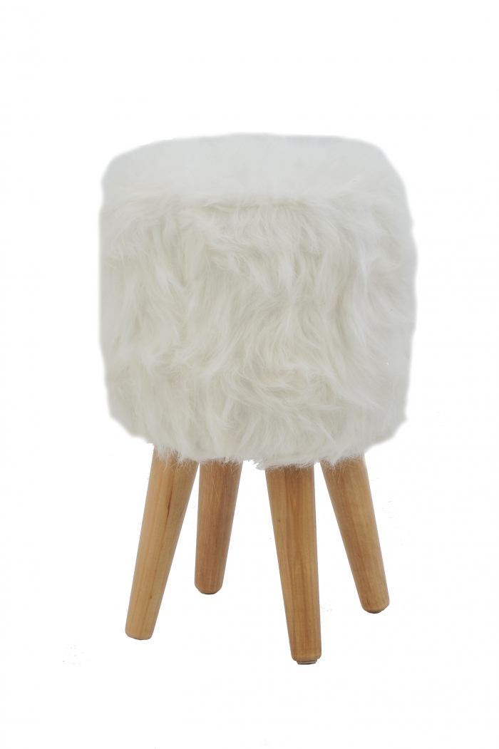 Banqueta em madeira de pinho estofada com espuma e revestida em pelo artificial (100%poliéster) com pernas de apoio em madeira, não possui braços e encosto.