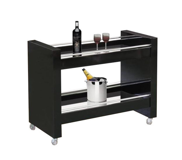 Carrinho de bar com estrutura em madeira, disponível em diversas tonalidades, com opção de vidro ou espelho ao fundo da bandeja.