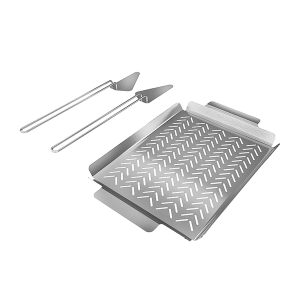 Material em Inox 304. –Acompanha 2 Espátulas com cabos longos, para manuseio rápido dos ingredientes. – Área útil: 335 x 258 mm. – Medidas: 444 x 302 x 33 mm